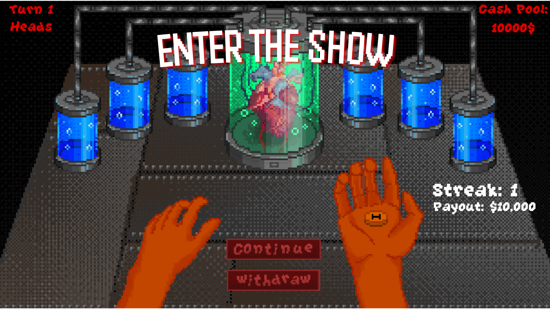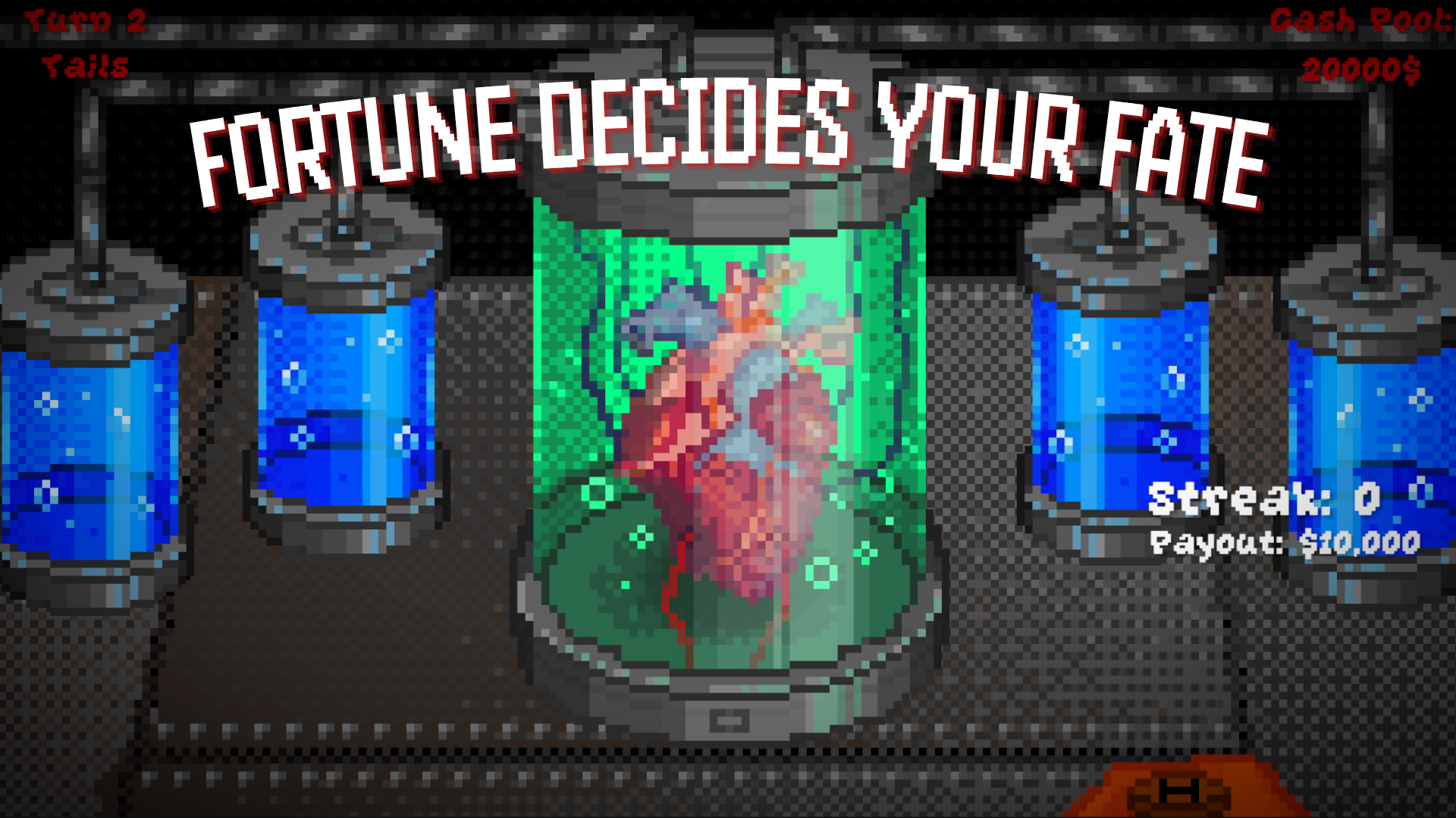 The game revolves around the simple premise of a coinflip, You the player will earn 10000$ upon every flip of a simple coin. Upon a heads result you are free to withdraw from the competition along with your funds, But upon a flip of a tails the game becomes more.... Dangerous. Once tails has been flipped You select between six vials, One of which contains a Cardiotoxin that will attack your life support system, killing you and ending the game. You must juggle with the possibility of riches and the safety of withdrawing to try and reach the highest possible amount of money you can and escape with your life to secure it as your own.